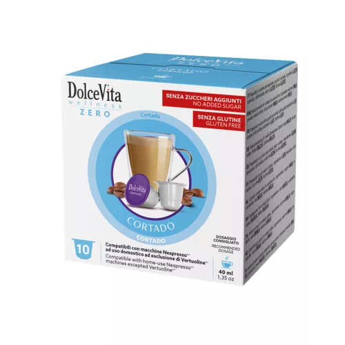 Cortado 10 capsules de café pour Nespresso. Le café cortado "coupé"est un café espagnol à faible acidité, composé d'un espresso et de la même quantité de mousse de lait.